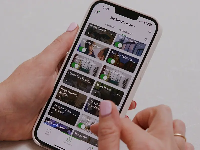 Michaela has created an ‘Entertaining Moment’ that transforms their al fresco area with a single screen tap when they have friends and family over. “Instead of running around to put all these different lights and fans on, I can do it all on the Wiser app. It turns the pool lights and the water feature on, both outdoor fans are spinning and it just brings a really nice ambience to the outdoor living area.”