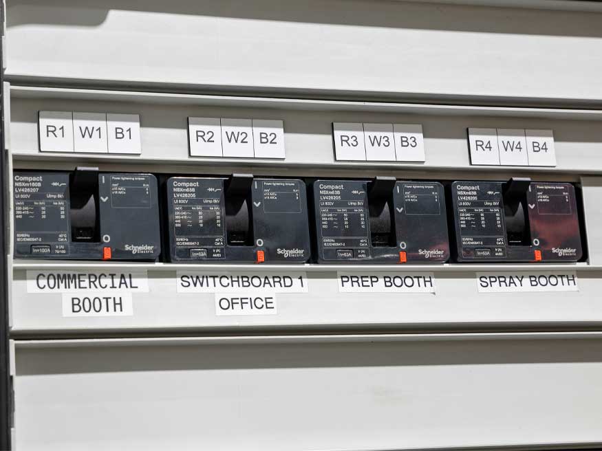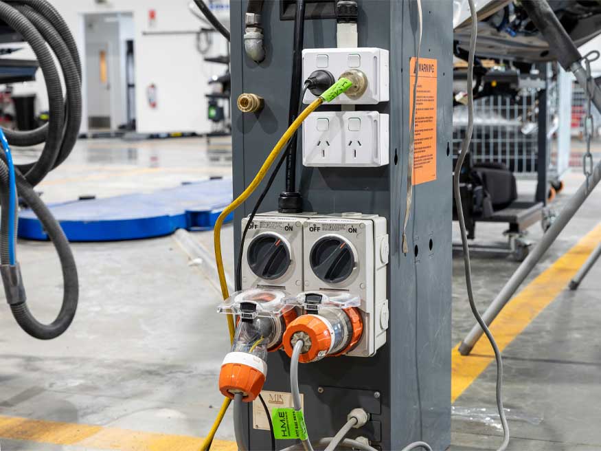 For such a unique working environment there were some custom solutions that Rob and his team needed to carefully think through to keep with the vision and needs of the workspace requirements. “We had to create custom droppers to get power to some of the central working bays. We couldn’t have power running up from the floor. So we ran an overhead tray, which is about 5 metres up in the air, and then we had to run a wire down and bound the 56 Series outlets to it, and then put a Pro Series mounting block on the back of those. So essentially, they are floating in the air, which enabled more power options and flexibility in the workshop.” The innovative solutions from Rob’s team didn’t end there, with other droppers also needed for the car hoists, and Pro Series power outlets mounted on those as well.