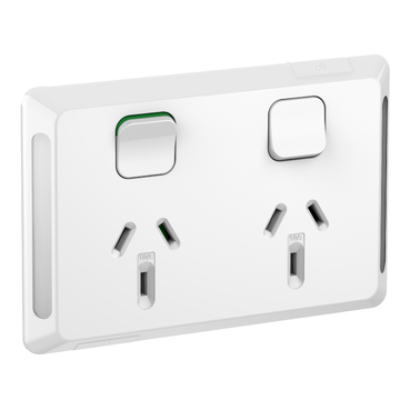 Socket outlet assembly for horizontal installations. Twin switched socket. Pro Series skin and socket grid are included. PDL Pro Series. Colour: Extra White Rated current: 10A Operating voltage 250V a.c. 50Hz Note: Requires installation by an appropriately licenced electrician.