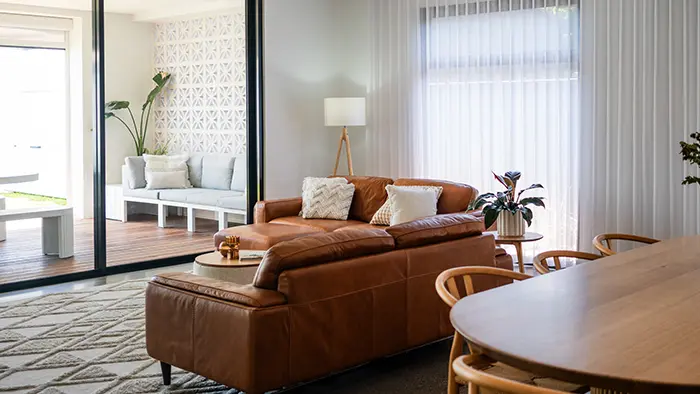 Modern living room with a brown leather sofa, white lamp, indoor plants, and a wooden dining table.
