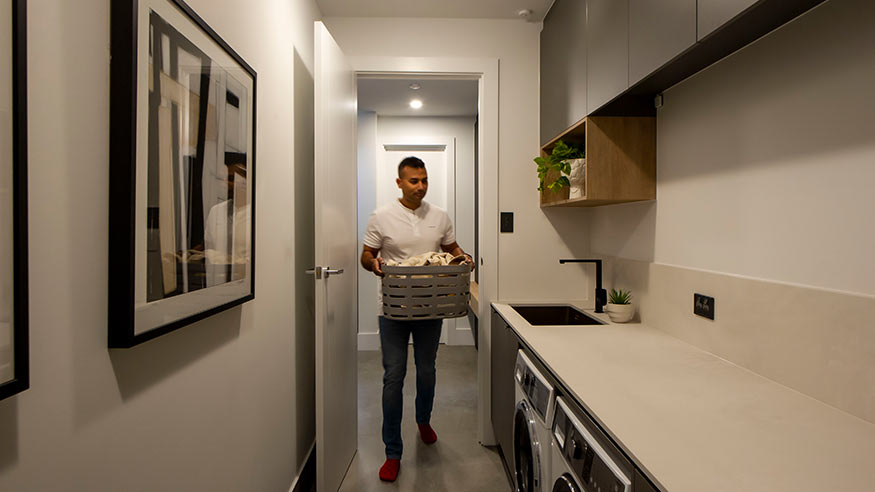 Man carrying his laundry basket in a well-lit laundry room with washing machines and dryer