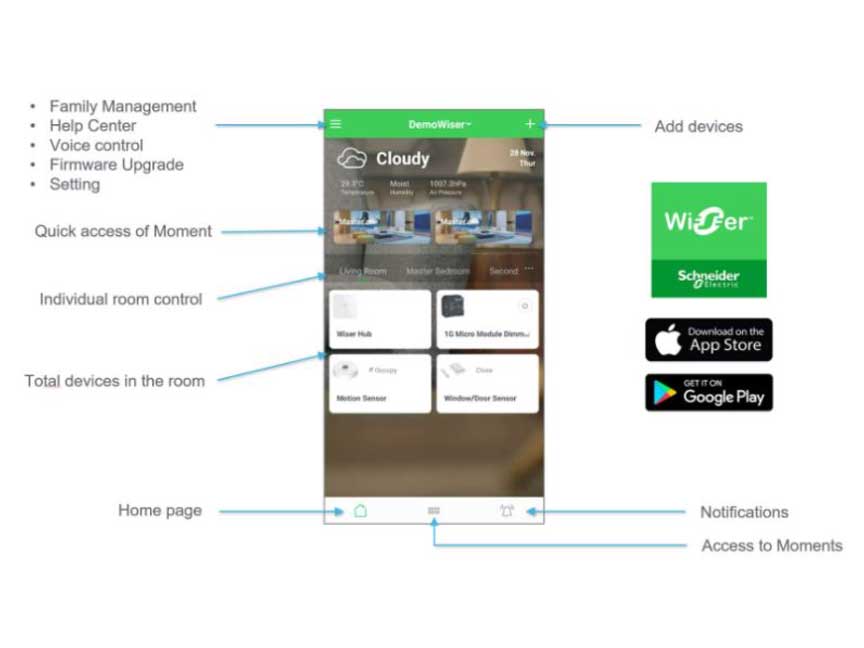 - Simple control of your Wiser devices within a room or from anywhere in the world when used with the Wiser Hub
